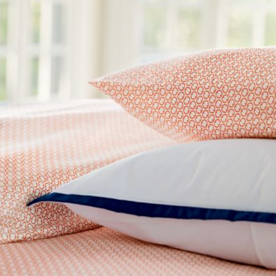 The vibrant Pimento French Ring Sheet Set provides a wonderful contrast against the calming blue and white Catalina bedding.