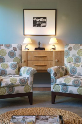 Here’s a much better image of the Zinnia fabric on a pair of chairs. The blues and greens are more accurate in this photo found in Brooke Giannetti’s Velvet & Linen post Color is a good thing.