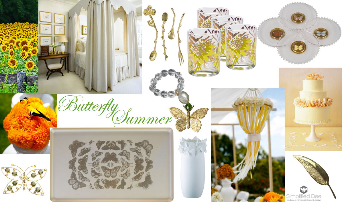 I’ve done it again! This time I entered AphroChic’s VIVRE Summer Tablescape Contest and my entry is below. “Butterfly Summer” was inspired by Phoebe Howard’s gorgeous bedroom design in the Atlanta Showhouse (above). The room’s neutral palette is peaceful and airy. It reminded me of a lazy summer day and the life the warmest season brings us – butterflies, sunflowers and sunshine. The moodboard’s images also evoked fond memories of my Grandma Virginia and her love for sunflowers.
