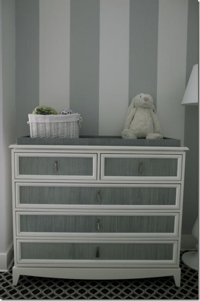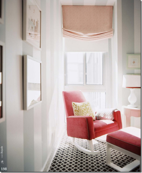 SG: We used a classic wool rug with a timeless geometric pattern in charcoal grey, celadon green, and slate blue to hide stains. The room had a tremendously high ceiling so we added silver star wallpaper on the ceiling and a custom painted pale blue and white circus tent stripe on the walls to add a sense of whimsy to the room. The deep mulberry colored rocking chair is one of my favorite pieces. It is so comfortable and the shape makes it perfect for a growing child ( not stuck in a nursery forever).