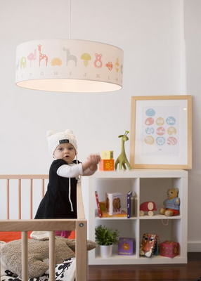 The Animal Alphabet Pendant adds a touch of whimsy to this modern nursery.