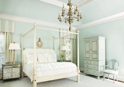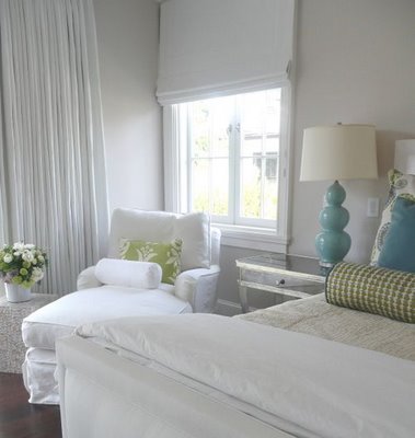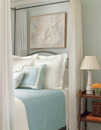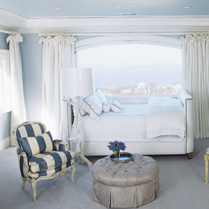 I just love how this cloud-like bed is centered under the arched window. Simple, crisp white linens and soft blue walls (Benjamin Moore’s Misty Memories) bring the outside in. So dreamy. Love the antique blue and white striped French Rococo period chair with the round tufted ottoman in this otherwise contemporary room. Perfect for a city girl. Image from House Beautiful.