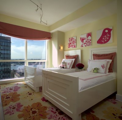 The floral rug in this sweet contemporary bedroom by NY designer, Evelyn Benatar sets the tone for the whole room. Love the monogram pillow cases. Nice touch to help personalize a room shared by sisters.