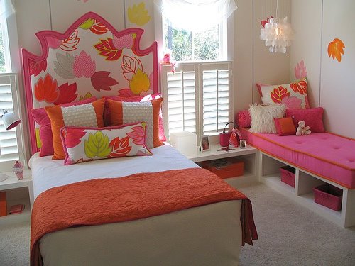 Love this color palette. It’s hard to say what’s my favorite element in this darling bedroom showcased in the Southern Living Idea House 2005. I’m torn between the beautiful leaf inspired upholstered headboard (custom, I am assuming) and the pink with orange trim reading bench. That chandelier is gorgeous; if you know the manufacturer, please let me know. Image from flickr.