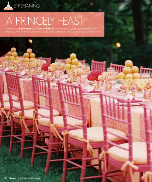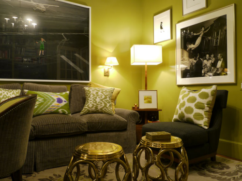 Benjamin Moore’s Jalapeño Pepper covers the walls in the study. Gorgeous ikat pillows by Madeline Weinrib are layered on the sofa and slipper chair. A pair of 1940’s brass bar stools are place in front of the sofa and used as drink tables.