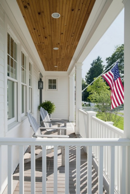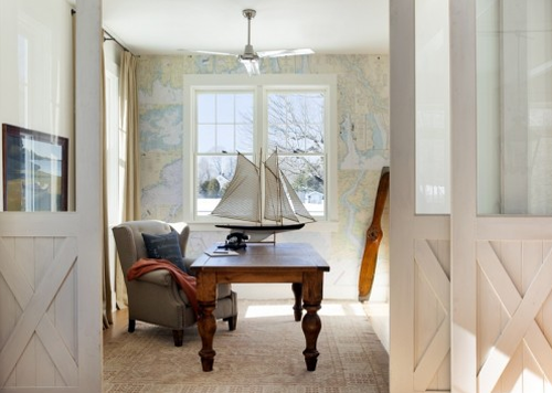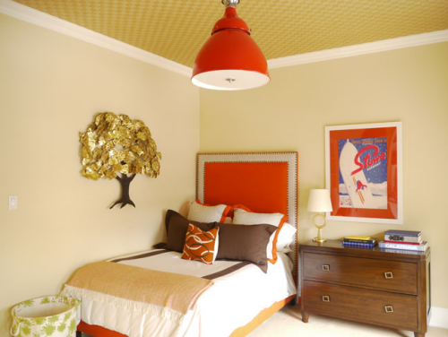 Here is a look at Amanda’s boy’s bedroom. The persimmon banded headboard with nail head, vintage tree art and wallpaper ceiling are my design favorite elements.