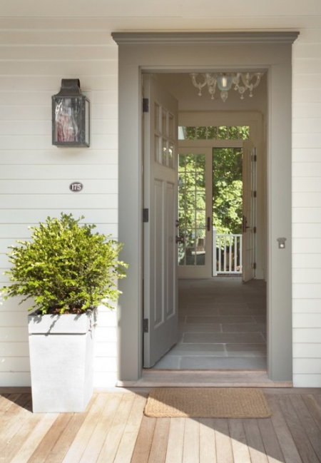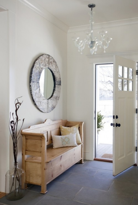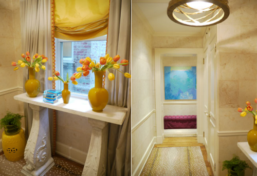 In the front entry {above} colorful tulips greet guests and bark skin handmade paper from Caba Company covers the walls.