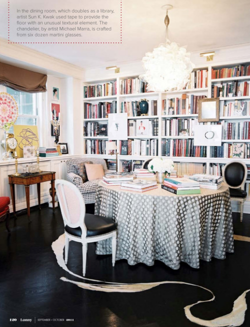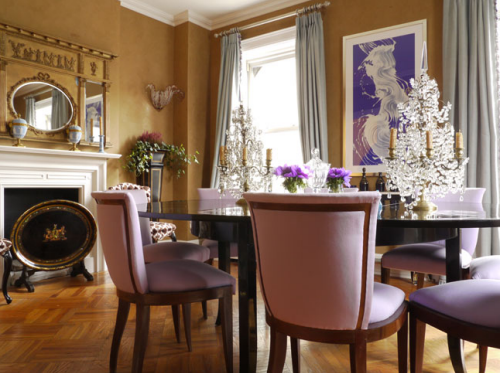 The formal dining room features beautiful parquet wooden floors, crystal scones from Niermann Weeks and stunning crystal girandoles atop the dining table {a family heirloom}. Between the windows artwork, ‘White Wave’ by James Nares coordinates with the lilac covered dining chairs and really pops against the Venetian plaster walls.