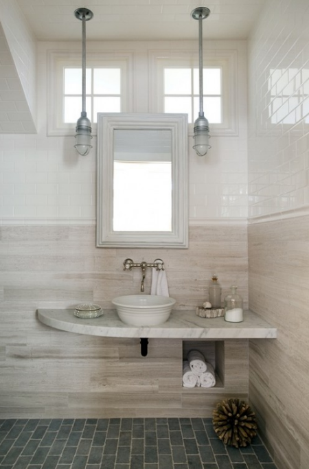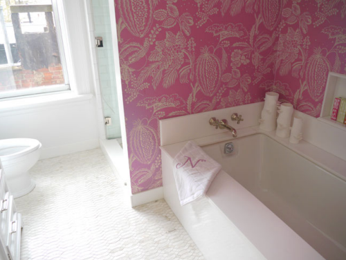 The color pink is carried into the master bath with the ‘Pali’ wallpaper by Manuel Canovas. It is a bold statement and apparently one that surprised her husband.