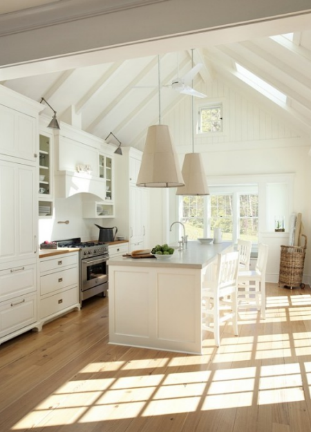 The eat-in kitchen breakfast nook has also been updated {see the old version below}. The cozy banquette is now covered in an avocado leather or vinyl fabric and a banded Roman shade replaces blinds. The chairs, table and photo art remain the same.
