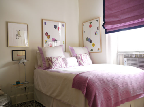 Amanda’s daughter’s bedroom features shades of lavender in the Roman shade, throw pillows {love the ikat!} and throw at the foot of the bed. And more outstanding artwork!