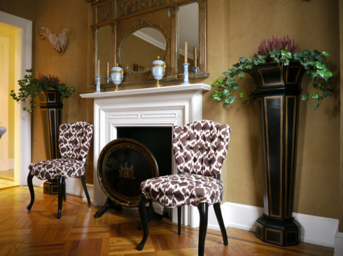 Love these tufted chairs covered in a brown silk ikat fabric with black lacquer legs flanking the traditional fireplace mantel in the dining room.