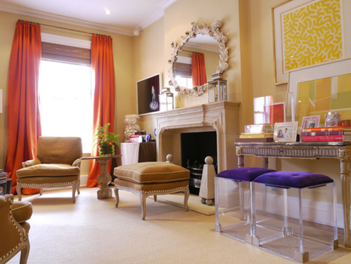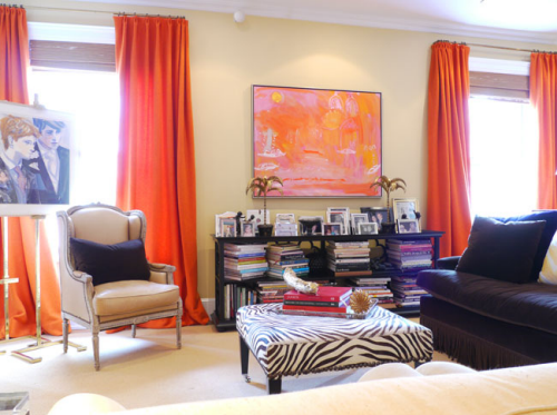 Original artwork in various styles is hung throughout the living room. Between the widows draped in tangerine fabric by Pierre Frey, an abstract painting by artist Maureen Russell is hung. For a coffee table, Amanda selects a playful ottoman upholstered in a zebra print.
