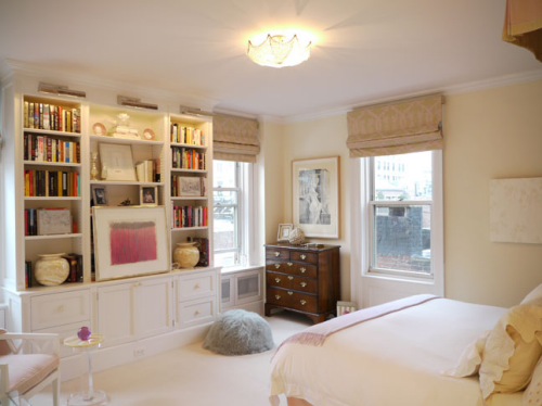 Amanda’s master bedroom is serene. A muted palette of pink and yellow are quiet feminine. Farrow & Ball ‘Tarlow’ covers the walls. A built-in, white bookcase provides additional storage and adds visual interest to the room.