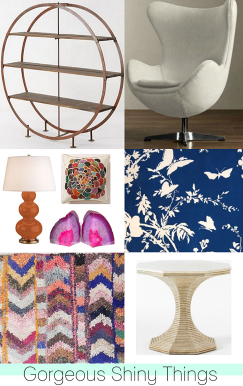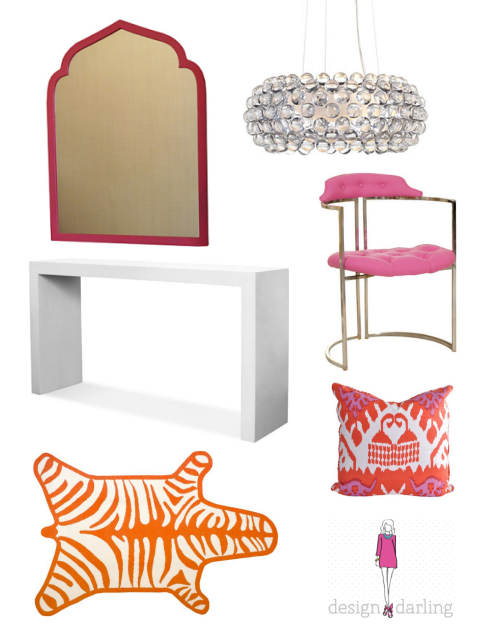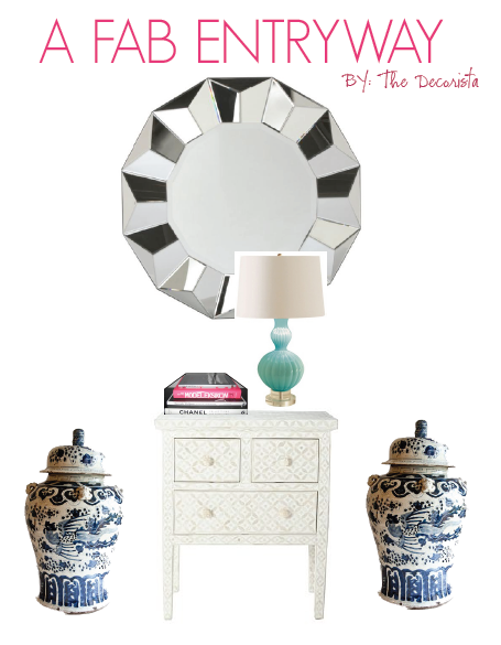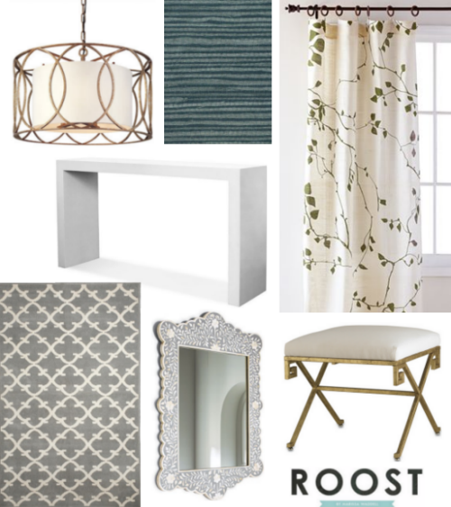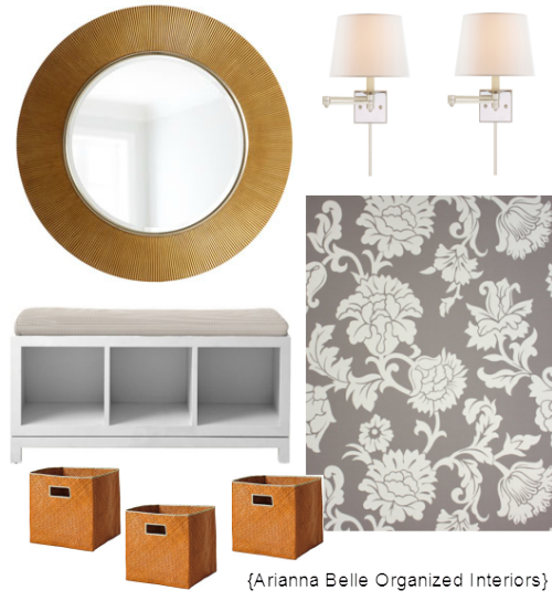 mirror – a necessity in any entry. The Golden Rays mirror from Neiman Marcus would add warmth and tie in beautifully with the color of the bins. To add lighting, I’d place a