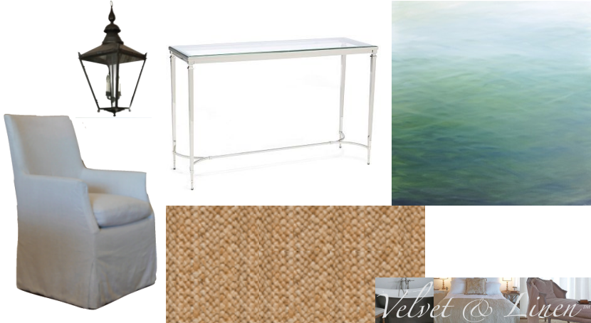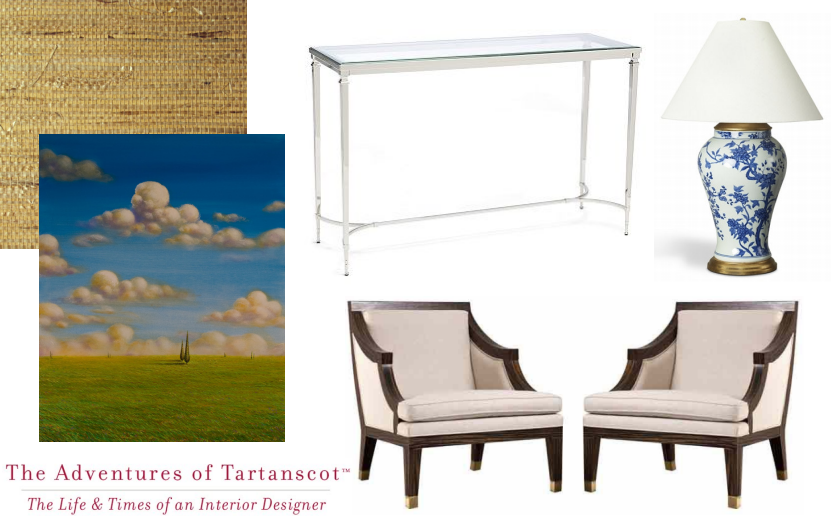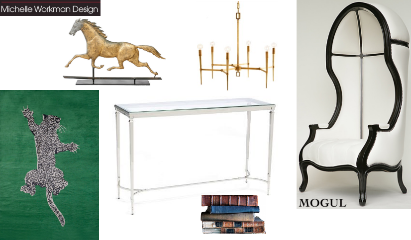 Los Angeles-based designer, Michelle Workman of the blog, Furnishing a Fabulous Life created a “New English Study” with the Williams Sonoma Home console table. Filled with books, this very hip study or library would be painted a forest green. To anchor the space Workman adds the Climbing Leopard rug by Diane Von Furstenberg. She also includes a pair of chic canopy chairs in white patent leather from Mogul. For a big of “old” an antique Gilded Running Horse Weathervane from 1st Dibs is added on the console. From the ceiling, Michelle hangs a timeless chandelier – the Aurburn from Arteriors Home.