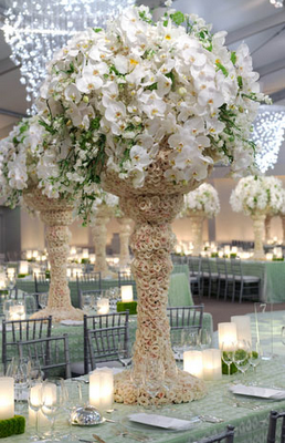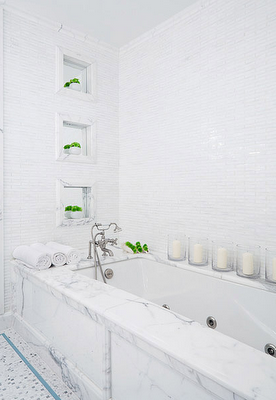 The master bath is also a peaceful retreat with the sunken Jacuzzi tub surrounded by a calacatta marble slab and hand-cast white glass tiles from Ann Sachs. The three vertical marble insets add visual interest and mossy plants bring hints of the outside in.