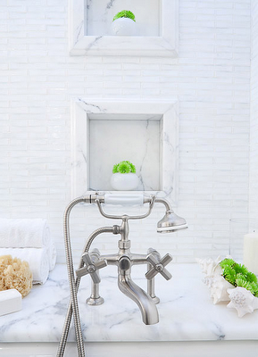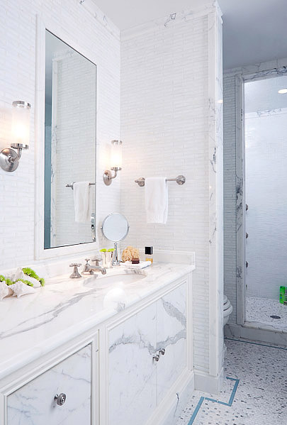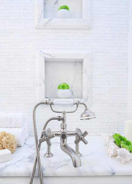 Here’s a closer view of the faucet by Kallista, hand-cast white glass tiles from Ann Sachs and calacatta marble.