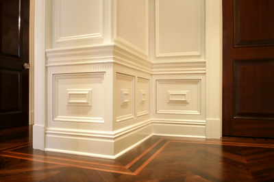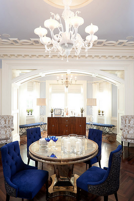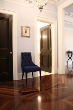 A flooring detail in a custom dark stained French-cut Peruvian walnut and a tufted navy blue chair by Baker welcomes guests into the formal the dining room.