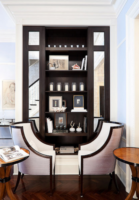 Rich custom millwork shelving with sliding doors in ebonized mahogany and antiqued mirrors set the perfect stage for an intimate sitting area just off the formal living room. The curves of the Emma Lounge Chairs by Madeline Stuart and walnut Osterly side tables by Dessin Fournir soften the space that is dominated by strong lines in the display unit, flooring and crown molding.