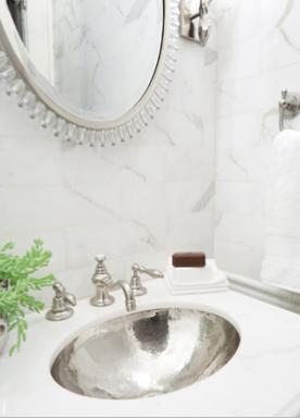 The custom vanity topped with calacatta marble in the powder room is a standout and surrounds a gorgeous nickel undermounted sink and faucet from Waterworks. The fabulous mirror is by Baker.