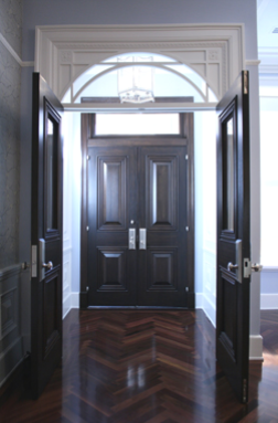 On the townhouse’s parlour floor, the focus of the formal living room is the custom mantle by Chesney’s. It’s beautifully framed by original portraits by various artists from auction. The furnishings are exquisite. I particularly like the klismos inspired contoured legs supporting the mahogany coffee table by Troscan. The sweet nesting tables by Emile Galle are antique. The calming blue and white custom wall, ceiling and trim paint by Benjamin Moore contrasts beautifully with the masculine dark wood furniture and flooring. Adding feminine touches, the elegant multi-armed chandelier was purchased at Remains Lighting. The Farrells struck a perfect balance and created a room that both genders would feel comfortable in.