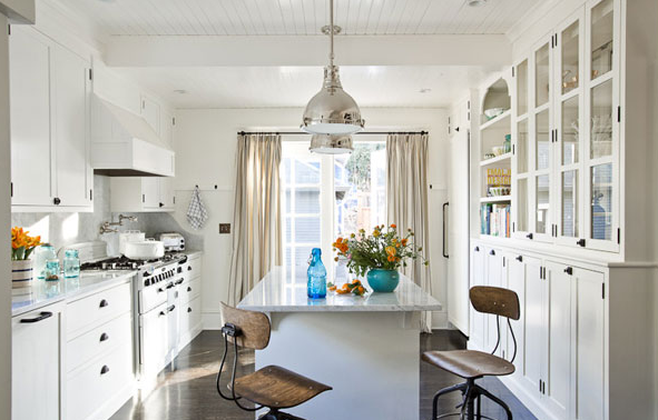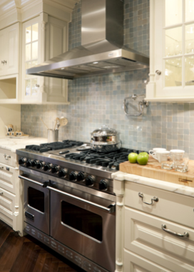 Then the soft white and blue color palette continues in the home’s kitchen. The custom millwork cabinetry is painted in Benjamin Moore. The professional grade range is by Viking and the stunning back-splash in hand-cast glass tiles is by Ann Sachs.