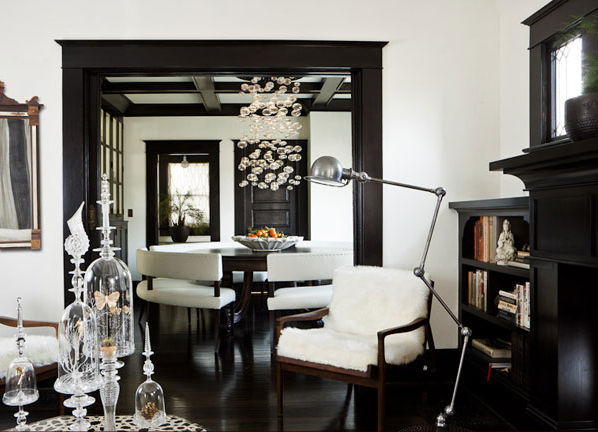 In addition to the home’s history and architecture, the interior designers were influenced by two things; First was Austrian design legend Dagobert Peche (1887-1923) and the Weiner Werkstätte (est. 1903, Vienna Workshops for a community of visual artists) and the quirkier aspects of Viennese turn of the century design. Second was the of-the-day styles coming out of Belgium – specifically the clean lines and high contrast architectural finishes. Farrell says, “These design influences worked well with our clients, considering the husband’s preference for adapted modernism and the wife’s love of traditional ornamentation. So we set off to truly and honestly explore the term “transitional.” We did not want to make the common mistake… jamming a Louis XV leg onto a case resembling a creation by Corbusier. Instead, we wanted to attempt to create a seamless melding of time – an interior that is just as fresh and comfortable while it reminisces on the days past as it is stepping into the days to come.”