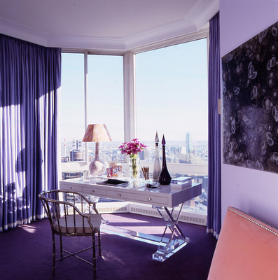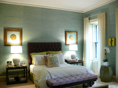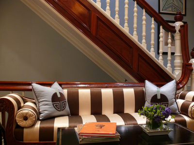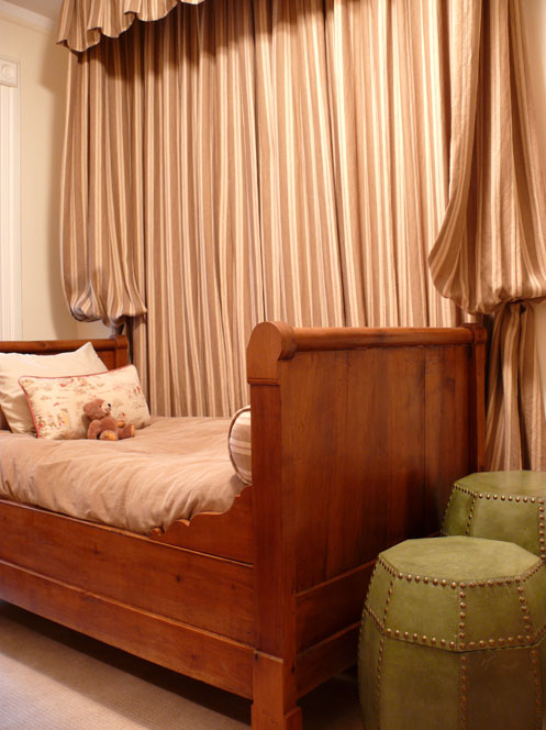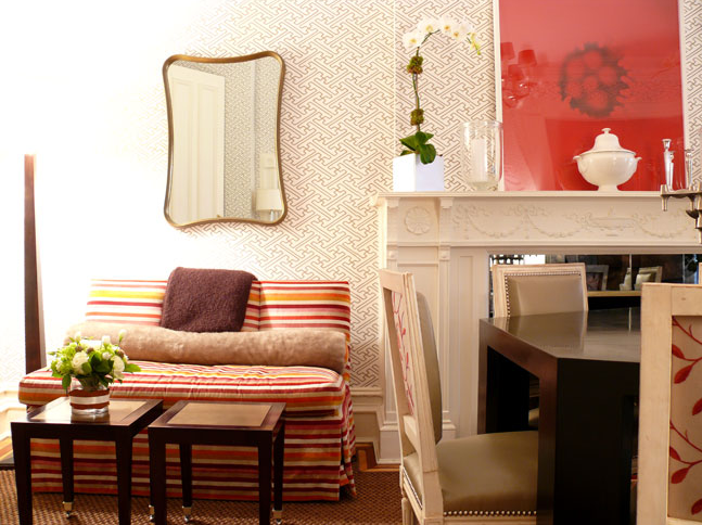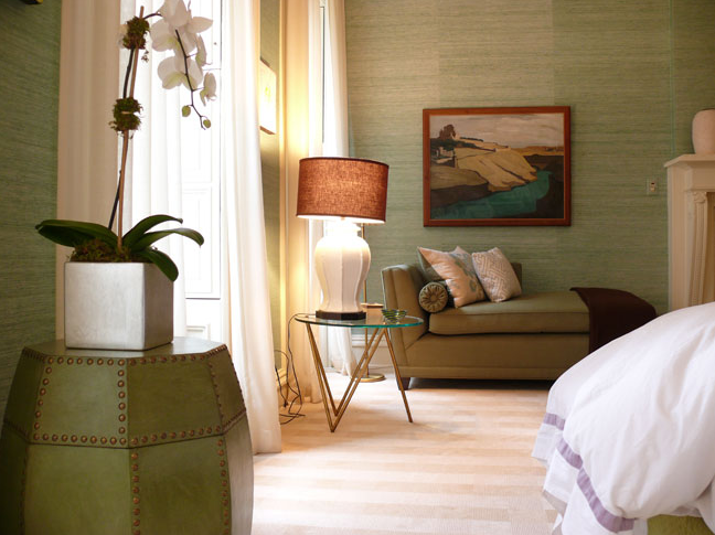 bedroom showcased a beautiful king size bed in a gold and lime throw spread – gotta love the trim! I found it interesting that the stone wall was kept natural. My favorite elements in the room were the matching Italian Faience white table lamps and tufted yellow bench. Both are popular today.