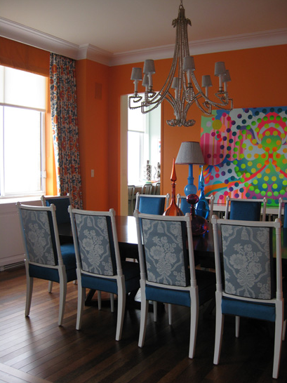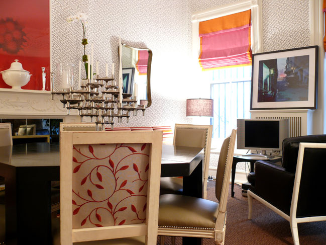 The round game table in a dark antique finish was in a third bedroom that served as the den. The lighting in this picture is not ideal, but these chairs with nailhead trim are upholstered in a fun retro crushed velvet orange are fantastic – the color is making a comeback.