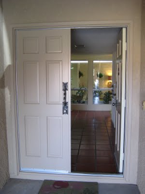 Dark red 12″x12″ tiles floored the double door entryway which led to a small atrium.