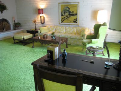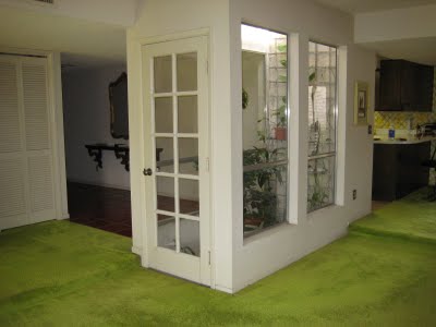 Here is a view of the atrium from the living room. The retro shag lime green wall-to-wall carpet was installed in the living, dining and bedrooms.