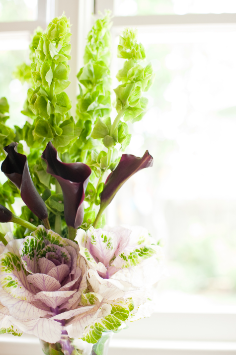 In a clear glass vase, I layered the ornamental cabbage with black calla lilies {actually a beautiful prune purple color} and bells of Ireland {a nod to our ancestors from Ireland}.
