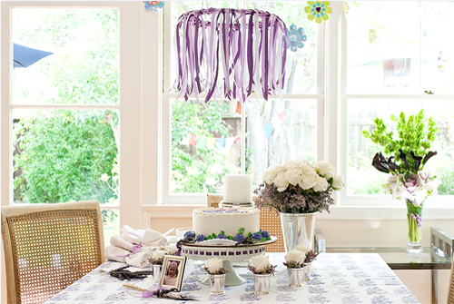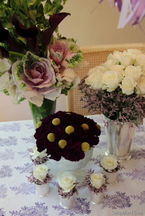Last week I showed glimpses of a family celebration for my daughter and explained how I made the Martha Stewart-inspired ribbon chandelier. Today, I’m sharing the floral arrangements. Fresh flowers are a beautiful way to decorate an event and pull together a color scheme. I’ not a professional, but love arranging flowers and wanted to create some for our family celebration.