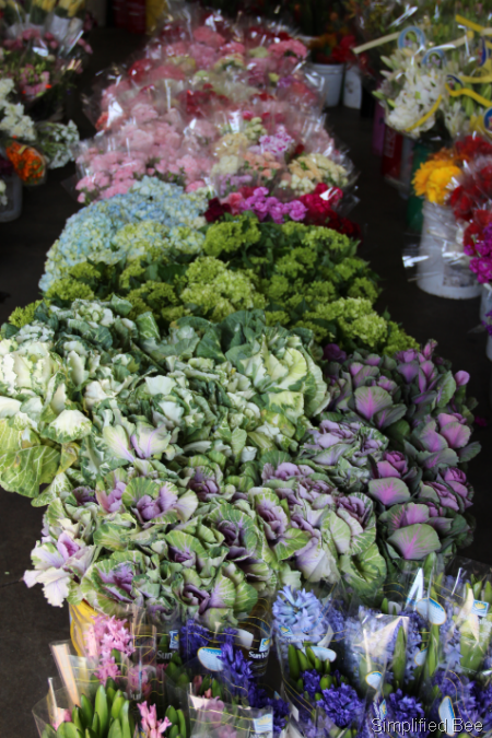 A couple days before the event, I went shopping at the San Francisco Flower Mart and boy was it inspiring. It’s a great time to go because the vendors are over-flowing with gorgeous springtime flowers. To coordinate with the event’s purple color scheme, I was drawn to these beautiful cabbage {aka brassica} with lavender centers and knew I had to use them some how.
