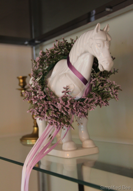 The misty blue floral wreath didn’t stay in my daughter’s hair and end up hanging around the neck of our white ceramic horse. We thought it fitting though because it was also the day of the Kentucky Derby.