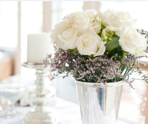 Six mini mint julep vases I purchased on One Kings Lane arrived the day before the event and as I was arranging the flowers. I didn’t plan on using them, but it was meant to be. Originally, I had clipped five white roses to be placed in a wreath for my daughter’s hair. The first hair wreath had white roses with sprigs of misty blue – it was way too heavy looking and a no go. I ended up only using the misty in the wreath hairpiece and although not perfect, it was sweet. I thought to myself, “Why did I cut these roses prematurely? They are too short to do anything with. What a waste.” Then I remembered the sweet mint julep vases. I decided echo the larger white rose & misty mint julep arrangement using the petite mint julep vases.