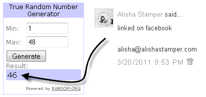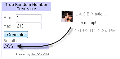 • Entry period closes at 9 pm PST on Monday, March 21, 2011. The winner will be chosen by Random.org.