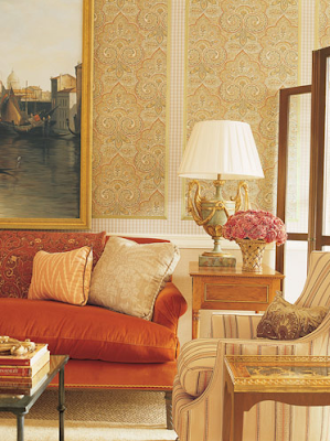 The inviting living room showcases stunning oil paintings of Italy from Charlotte Moss Interior Design. The persimmon sofas, striped chair, lemon pillows and skirted table are in Schumacher fabrics.
