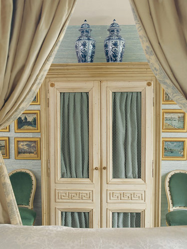 The armoire with coordinating fabric by Rogers & Goffigon is stunning – my guess is it’s hiding media equipment and the armoire’s design prevents it from overheating. It’s topped with a pair of Chinese urns and flanked by side chairs from Charlotte Moss Interior Design. The room’s aqua textured wallpaper by Phillip Jeffries is simply gorgeous next to the chairs covered in velvet by Vervain.