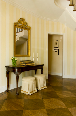 In this foyer, Billet Collins painted the wood floor in vibrant colors that are also either sheer colors or opaque for a more painted effect.