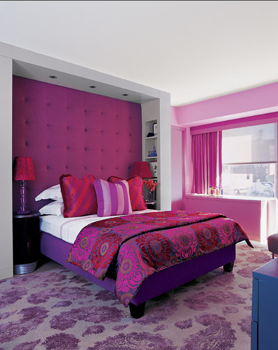 The master of color, Jamie Drake designs a stunning Manhattan bedroom in magenta, fuchsia and purple. Creating a focal point, Drake adds a dramatic custom button-tufted headboard wall in chenille from Cowton & Tout called Brasilia Lilas. The floral brocade bedspread is also from Cowtan & Tout.