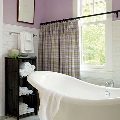 Designer Phillip Sides creates a soothing bathroom in the North Carolina home by using white subway tiles and painting the walls a soft lavendar – Classic Lilac (1002-5C) by Valspar. The cafe curtains in Manuel Canovas Suzon by Cowtan & Tout are hung mid-window to allow for natural light while still giving needed privacy.