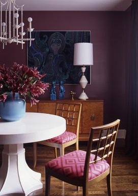 Charleston South Carolina’s Angie Hranowsky designed this ecclectic dining room with striking walls in plum. It work beautifully with the white accents – table, chandelier and table lamp and hints of blue – vases.