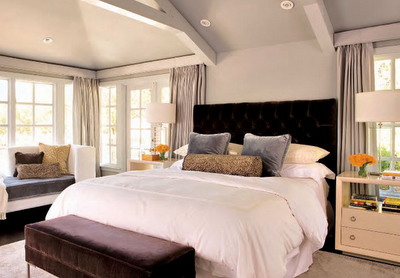 The tranquil, airy master bedroom features beautiful windows with ocean views. Zoldan uses the perfect mix of colors throughout the room. The dark gray custom bench and tufted headboard contrast beautifully with milky bed linens.