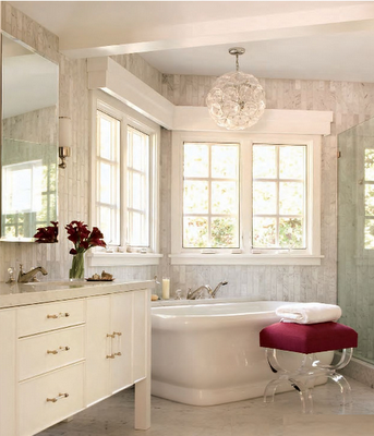 The serene master bathroom is perfection. The beautiful floor-to-ceiling Calcutta marble tile was vertically set. The raspberry bench with lucite X legs and glass light fixture are fabulous!