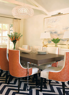 The dining room is a bit eclectic with modern, traditional and vintage elements, but Zoldan pulls it together brilliantly. I love the upholstered white chairs with with backs in a bold, textured orange fabric. The light fixture from Foscarini and the zig–zag rug by Jonathan Adler add more whimsical elements.