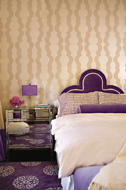 The sweet, yet sophisticated girl’s room in purple, pearl and beige is certainly one that any age would love. The beautifully designed headboard is brilliant with the pearlescent wallpaper, mirrored chest and chenille rug by Madeline Weinrib. I should have featured this room in a previous post,