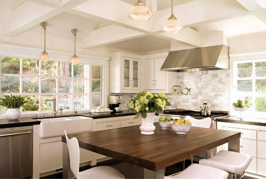 Natural light floods the simple, yet stunning white kitchen. The counter-high table with wooden top serves multiple purposes – it adds visual warmth, a place for family members to gather and of course, an additional food prep area. The white backless stools are from Design Within Reach.