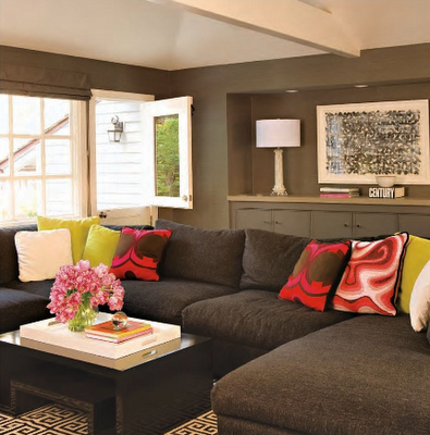 The media room features a large, inviting sectional sofa covered in a gray vintage velvet. Again, Zoldan adds vibrant pops of color with a collection of solid and geometric throw pillows. I am curious to know what color gray paint she used on the walls and cabinets.